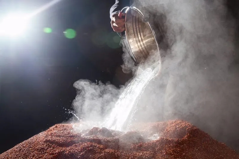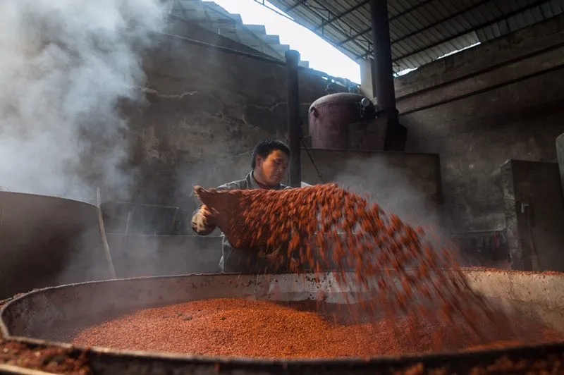 所谓“沙”,是茅台当地对酱酒原料红缨子糯高粱的一种爱称,“下沙”的意思就是“投料”。酱酒核心工艺“12987”中的“2”,特指“二次投料”,重阳节这次“下沙”是其中第一次,将河谷低处较早成熟的高粱投入生产,待一个月后,山岗高处的高粱成熟后,便要进行第二次投料。至此,一个年度周期的酱酒投料完成。