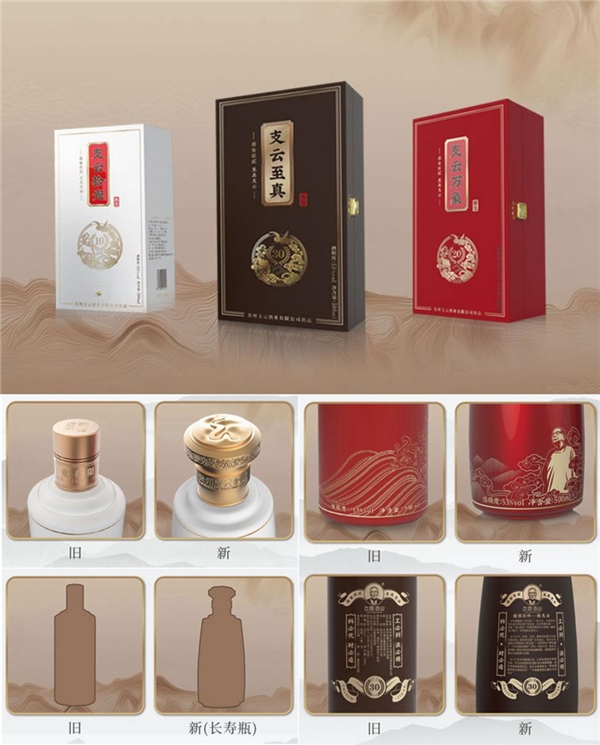 瓶身升级为支云酒业专利“长寿瓶”,瓶型手感细腻、线条流畅,寓意中正、温润,福寿绵长。