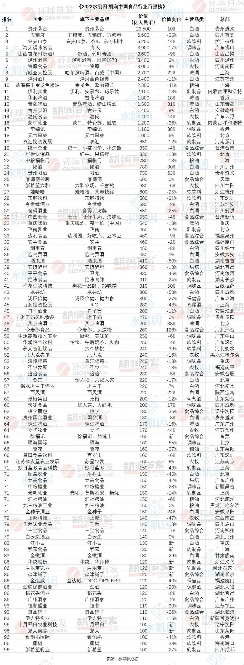 近日,胡润研究院发布“胡润中国食品行业百强榜”。该榜单按照企业市值或估值进行排名。上市公司市值按照2022年9月30日的收盘价计算,非上市公司估值参考同行业上市公司或者根据最新一轮融资情况进行估算。这是胡润研究院第二次发布“中国食品行业百强榜”。