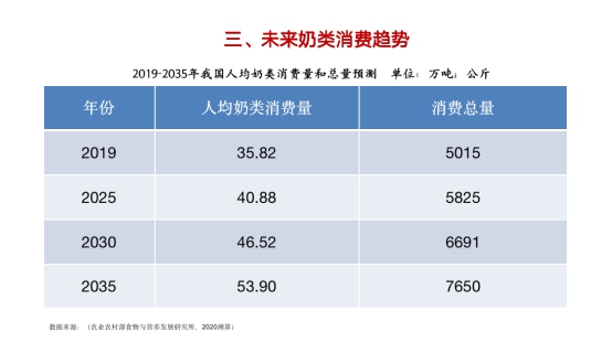 那么未来乳品市场有多大,发展趋势如何?对此,农业农村部食物与营养发展研究所动物中心负责人、中国奶业协会乳品营养与消费专委会副主任副主任程广燕提供了中国奶业协会营养与消费专业委员会的研究数据,提出了未来奶类消费趋势预测和分析,即到2025年,我国人均奶类消费量可达40.88公斤,消费总量5825万吨;到2035年,我国人均奶类消费量53.90公斤,消费总量7650万吨。