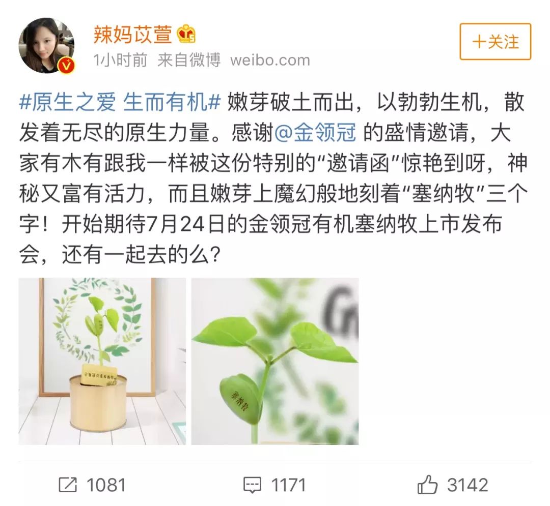 其实,引得明星大咖争相晒图的绿植,是金领冠有机塞纳牧上市发布会的种子邀请函。是的,你没看错,就是种子邀请函!想必纸质邀请函、电子邀请函,大家都已司空见惯,但种子邀请函,肯定很多宝妈都闻所未闻。