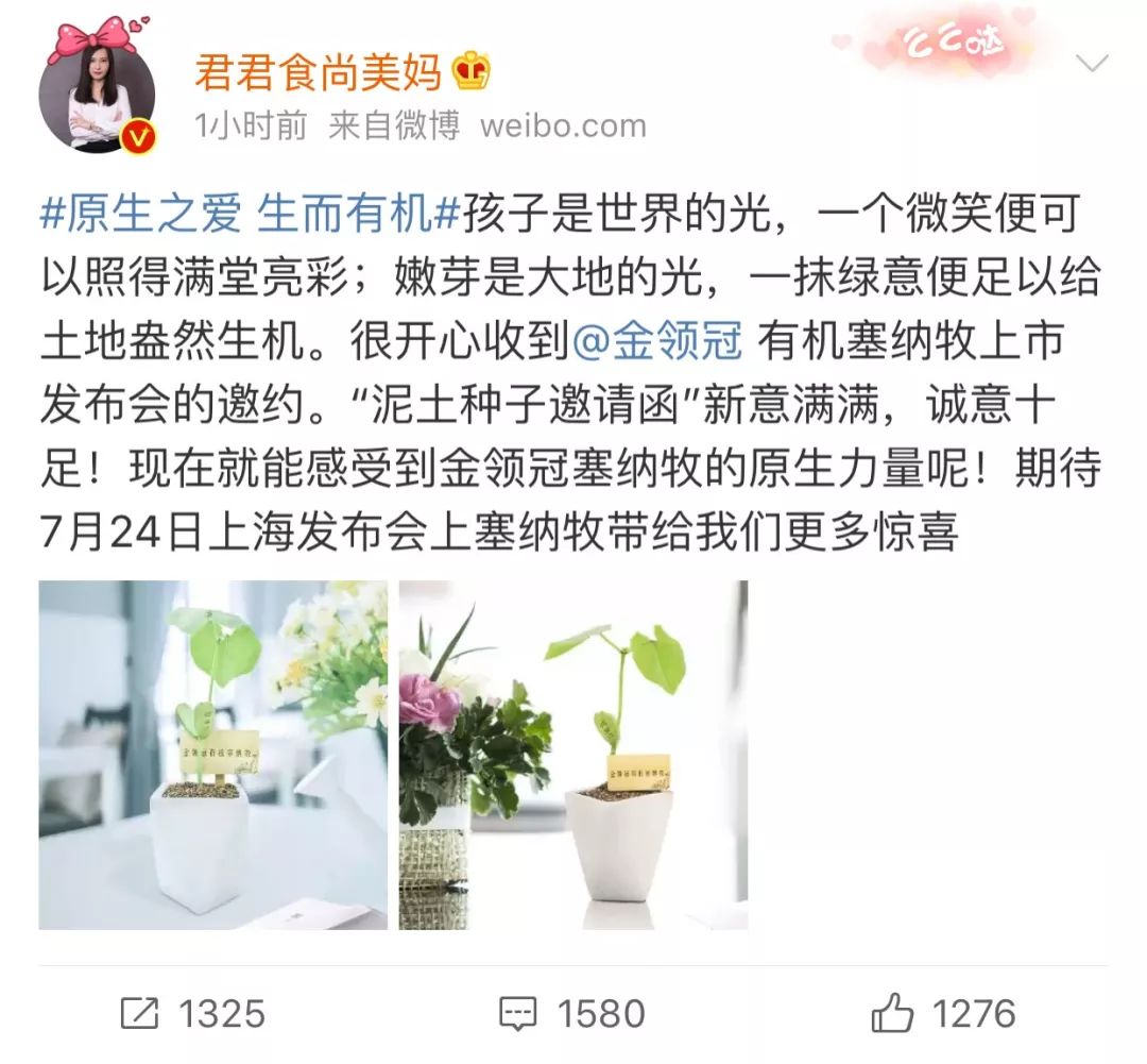 一颗小小的种子,为何能成为一份邀请函呢?仔细观察过这颗种子的宝妈不难发现,这份绿植的嫩芽中带有“塞纳牧”的字样,勃勃生机之中蕴藏着强大的原生态魅力。而在这份邀请函的背后,金领冠想传递的正是有机生活的态度以及有机的育儿理念。明星大V的争相分享,更是让这份特殊的邀请函成果跻身进入“网红”行列。不少网友甚至将其视为个人审美及生活方式的象征。