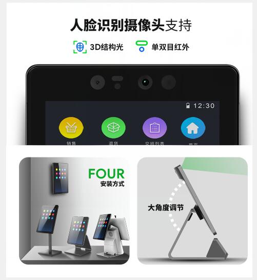 AECR F8人脸识别支付终端,不仅可连接收银小键盘独立使用,也可与台式收银机组合收单。其内置的人脸识别摄像头支持3D结构光、单双目红外等多种配置。立杆、台式、壁挂等多种安装方式,搭配可调节屏幕,为不同用户带来最佳刷脸角度。