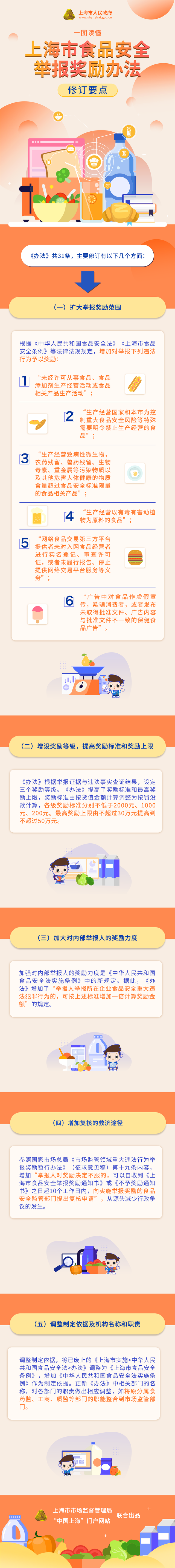 今年10月1日,修订后的《上海市食品安全举报奖励办法》正式施行。《办法》扩大了食品安全举报奖励范围;强调网络食品交易第三方平台的义务;增设奖励等级,提高奖励标准和奖励上限;加大对内部举报人的奖励力度。来看图解↓