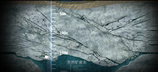天然矿泉水水源剖面示意图,水源为数百米以下的岩石层