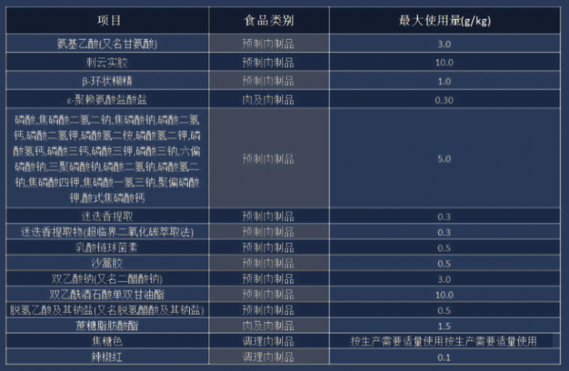2009年9月24日,卫生部等九部委下发通知,要求加强食品添加剂监督管理工作,有关肉制品食品添加剂部分限量标准指标如下: