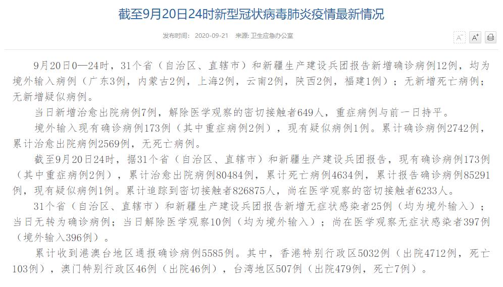 人民网北京9月21日电(董童)国家卫生健康委于今日在官网发布的《截至9月20日24时新型冠状病毒肺炎疫情最新情况》(以下简称“情况”)提出,9月20日0—24时,31个省(自治区、直辖市)和新疆生产建设兵团报告新增确诊病例12例,均为境外输入病例(广东3例,内蒙古2例,上海2例,云南2例,陕西2例,福建1例);无新增死亡病例;无新增疑似病例。当日新增治愈出院病例7例,解除医学观察的密切接触者649人,重症病例与前一日持平。