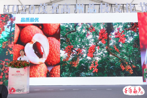 开幕式展示了“高州荔枝”品牌的过往。据史料记载,秦朝时高州就有荔枝生产,唐代成为贡品。唐代名宦高力士贡奉给杨贵妃品尝的荔枝,就采摘于高州根子贡园。“大唐荔乡”因此而得名。