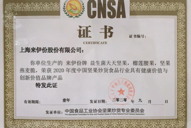 本届“中国坚果健康周”活动,来伊份“鲜”声夺人,接连斩获“2019年度全国坚果炒货行业综合经济(品牌)20强会员企业”、“2019年度全国坚果炒货行业优秀经销商会员企业”、“全国坚果炒货食品行业科学技术进步奖”等多项行业大奖,上海来伊份股份有限公司联合创始人兼总裁郁瑞芬女士荣获“2005-2020年中国坚果炒货行业杰出贡献女家”、副总裁王芳荣获“2005-2020年中国坚果炒货行业优秀经理人”等荣誉称号,同时来伊份益生菌天天坚果、榴莲腰果、坚果燕麦脆等三款产品荣登“2020 年度最具健康价值与创新价值产品品牌榜”。