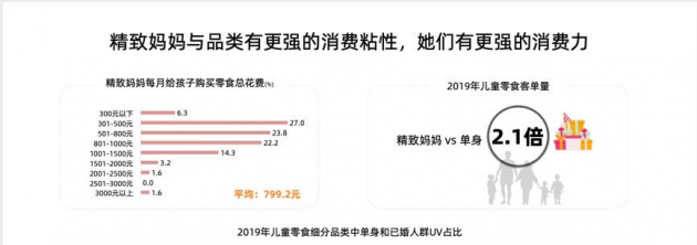 《儿童零食趋势洞察》指出,“精致妈妈”是儿童零食快速增长的主推力。天猫数据显示,她们每月平均会花799.2元给孩子买零食,相当于单身人士的2.1倍。