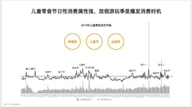 一方面,寒暑假、国庆节等大型节假日都集中在下半年,另外还有电商的大型促销节日“618”“双11”“双12”等。而2019年天猫的数据显示,儿童零食的销售高峰与节假日、电商大促节点高度重合,是商家突围的好时机。