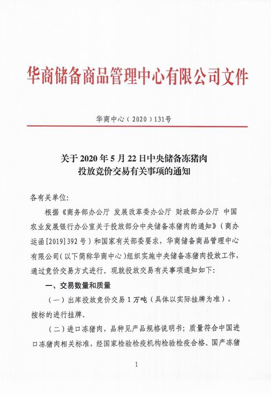 中新经纬客户端5月20日电 20日,华储网发布《关于2020年5月22日中央储备冻猪肉投放竞价交易有关事项的通知》称,5月22日将出库投放竞价交易1万吨中央储备冻猪肉。