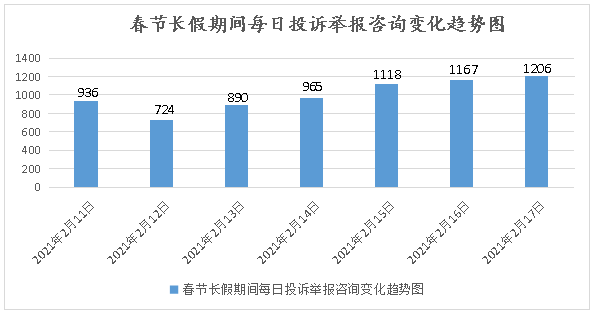 春节长假期间,安徽省市场监管部门12315热线平台共接收各类投诉举报咨询6976件(投诉1473件、举报147件、咨询5356件),从每日投诉举报咨询变化趋势来看,我省市场监管投诉举报咨询总体情况平稳。