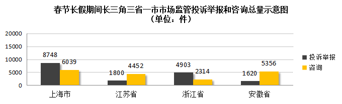 2021年春节长假期间,长三角地区三省一市市场监管部门深化12315协同联动机制,畅通公众诉求渠道,加大监管维权力度,优化节日市场消费环境。假日期间,三省一市12315系统共接到投诉举报17071件、解答咨询18161件,其中安徽省接到投诉举报1620件、解答咨询5356件;上海市接到投诉举报8748件、解答咨询6039件;江苏省接到投诉举报1800件、解答咨询4452件;浙江省接到投诉举报4903件、解答咨询2314件。