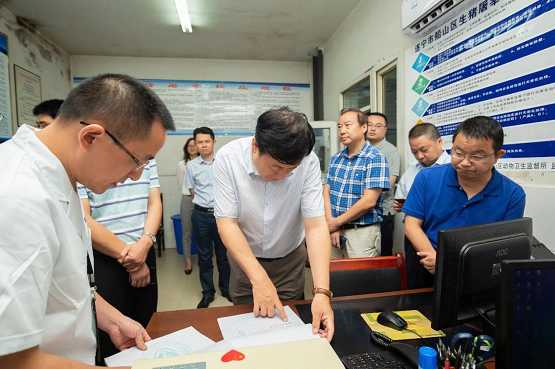 7月21日上午,农业农村部的调研工作组来到了遂宁市的高金集团。包括农业农村部党组成员、副部长于康震、农业农村部畜牧兽医局局长杨振海、四川省农业厅厅长杨秀彬在内的一行人来到遂宁,在高金集团常务副总裁赵勤的陪同下,视察高金集团鑫翰源养殖基地与动检中心,调研种猪繁育与生猪检疫情况。