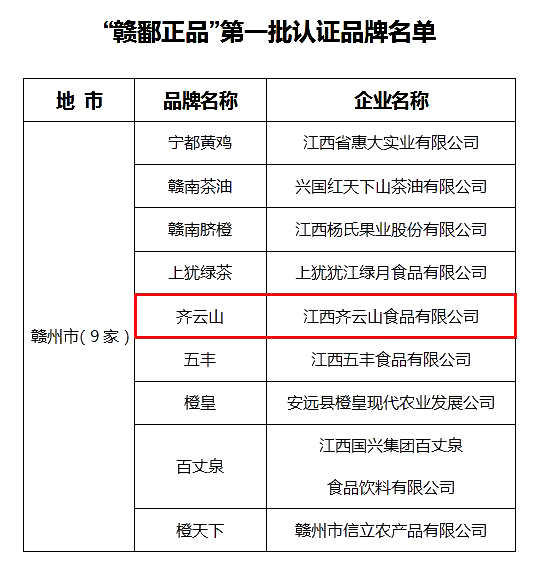 近日,省农业农村厅围绕2020年评定的江西“二十大农产品区域公用品牌”和“农产品企业品牌百强榜”,推选出了50家最具实力、最具代表性、最有品牌竞争力的企业品牌作为“赣鄱正品”第一批认证品牌,江西齐云山食品有限公司荣耀上榜!