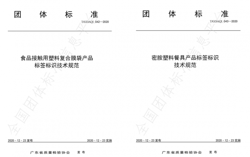12月23日,广东省质量检验协会正式发布《食品接触用塑料复合膜袋产品标签标识技术规范》《密胺塑料餐具产品标签标识技术规范》等两项团体标准。