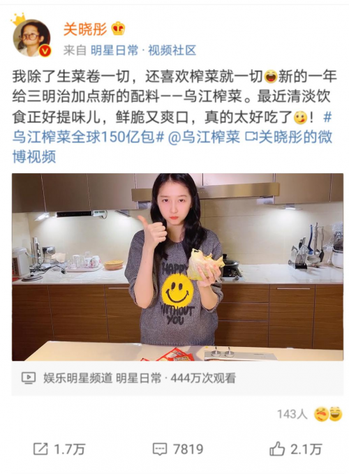 如果有一种东西被很多明星种草的话,那说明这种东西天生具有一种明星气质,二者能惺惺相惜。乌江榨菜就是这种具有“明星气质”的美食,作为中国人家喻户晓的“开味神器”,四小花旦之一的关晓彤也是乌江榨菜的忠实粉丝,她的美食真经不只是“生菜卷一切”还有“榨菜就一切”。在她的种草下,乌江榨菜热度高涨。