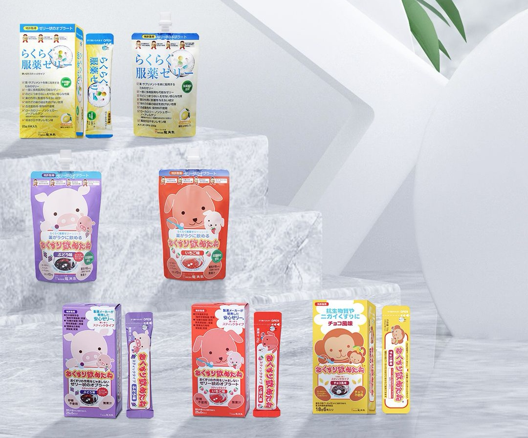 此外,针对服药难、吞药困难,以及多数对服药有抗拒的儿童,龙角散还研发了可以代替水的服药用辅助吞咽果冻系列产品。该系列产品,可以通过用果冻将药物顺利包裹,有助于消费者更加顺畅地吞咽药品,且缓和了药物气味和苦味。果冻成分中不含任何影响药物分解及吸收的成分,让人们不再为吃药发愁。
