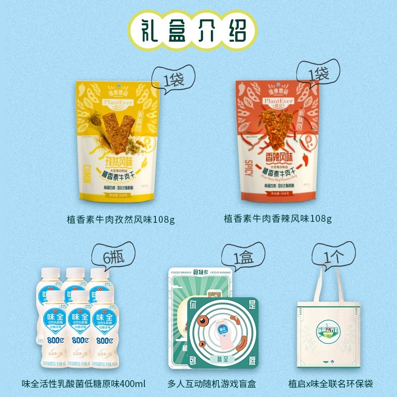 而作为本次礼盒发售的主角:植启植香素牛肉干和味全活性乳酸菌低糖原味饮品,也一如既往受到消费者的喜爱。