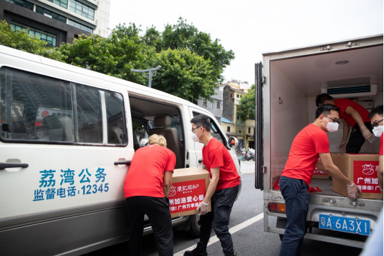 2021年6月5日上午,一辆满载着加油爱心餐的车辆缓缓驶进广州荔湾区领展购物广场,这辆从陈记顺和牛肉火锅总部出发的爱心捐助物资车,驰援在广州一线,只为保证抗疫工作人员在紧张高强度的工作后,能第一时间能吃上热气腾腾的食物。