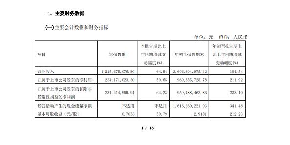 其中三季度当季实现营业收入12.16亿元,同比增长64.84%.归属于上市公司股东的扣非净利润2.31亿元,同比增长64.23%。