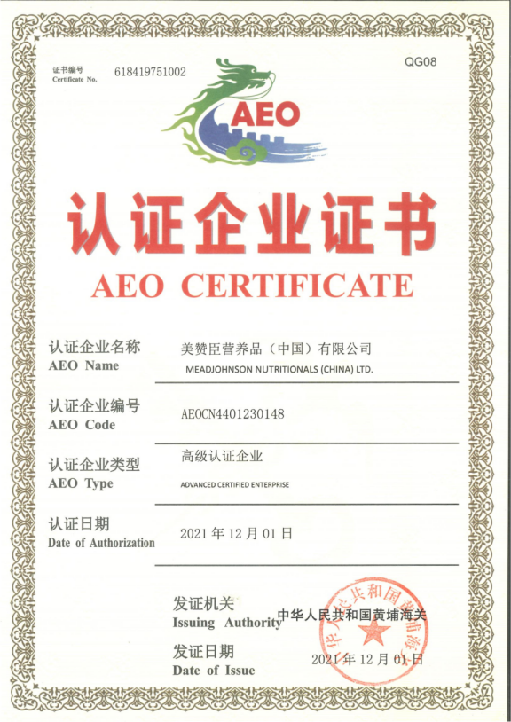 近日,美赞臣营养品(中国)有限公司通过海关AEO高级认证,成为首个获得该高级认证的婴幼儿奶粉国际品牌企业。据悉, AEO高级认证堪称进出口企业的“金字招牌",目前在中国海关注册登记和备案企业中,只有极少数的“明星企业”获得了海关高级认证企业资质。