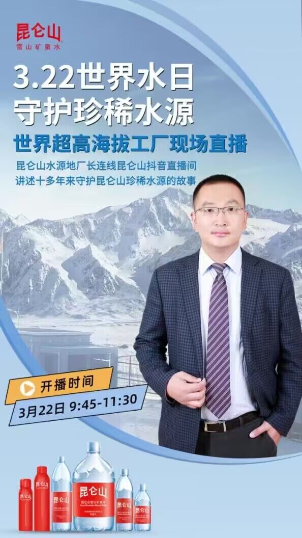 3月22日是第三十一届“世界水日”,我国第三十六个“中国水周”同时开启。今年“中国水周”活动主题为“强化依法治水携手共护母亲河”。当天,在中华母亲河的源头迎来了一场别开生面的直播——坐落于青藏高原三江源地区海拔4115米的昆仑山矿泉水工厂对外全景直播,邀请广大网友以云参观的形式领略万山之祖的巍峨,深入了解一瓶昆仑山矿泉水的诞生。