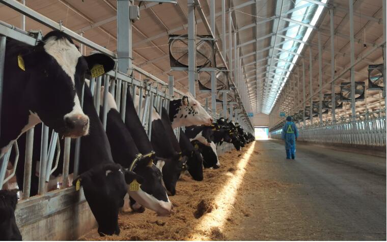 据朴诚乳业父爱牧场办公室主任张洪亮介绍,简爱父爱牧场于2022年正式投产。截至目前,这里有大小牛舍22个,牛只1万余头,其中泌乳牛达4000余头,日产生鲜乳180吨左右,承担着朴诚乳业80%的奶源供应。