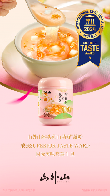 近日,国际风味评鉴所公布了有“美味奥斯卡奖”之称的2024年度国际美味奖章获奖名单。宋韵文化品牌山外山旗下新品猴头菇山药鲜藕粉(“鲜”指的是藕粉原料由鲜藕制成)凭借俱佳的口味与品质,获得国际美味奖1星奖章,也是近四年首个(截止至2024年1月数据)获此殊荣的藕粉产品。